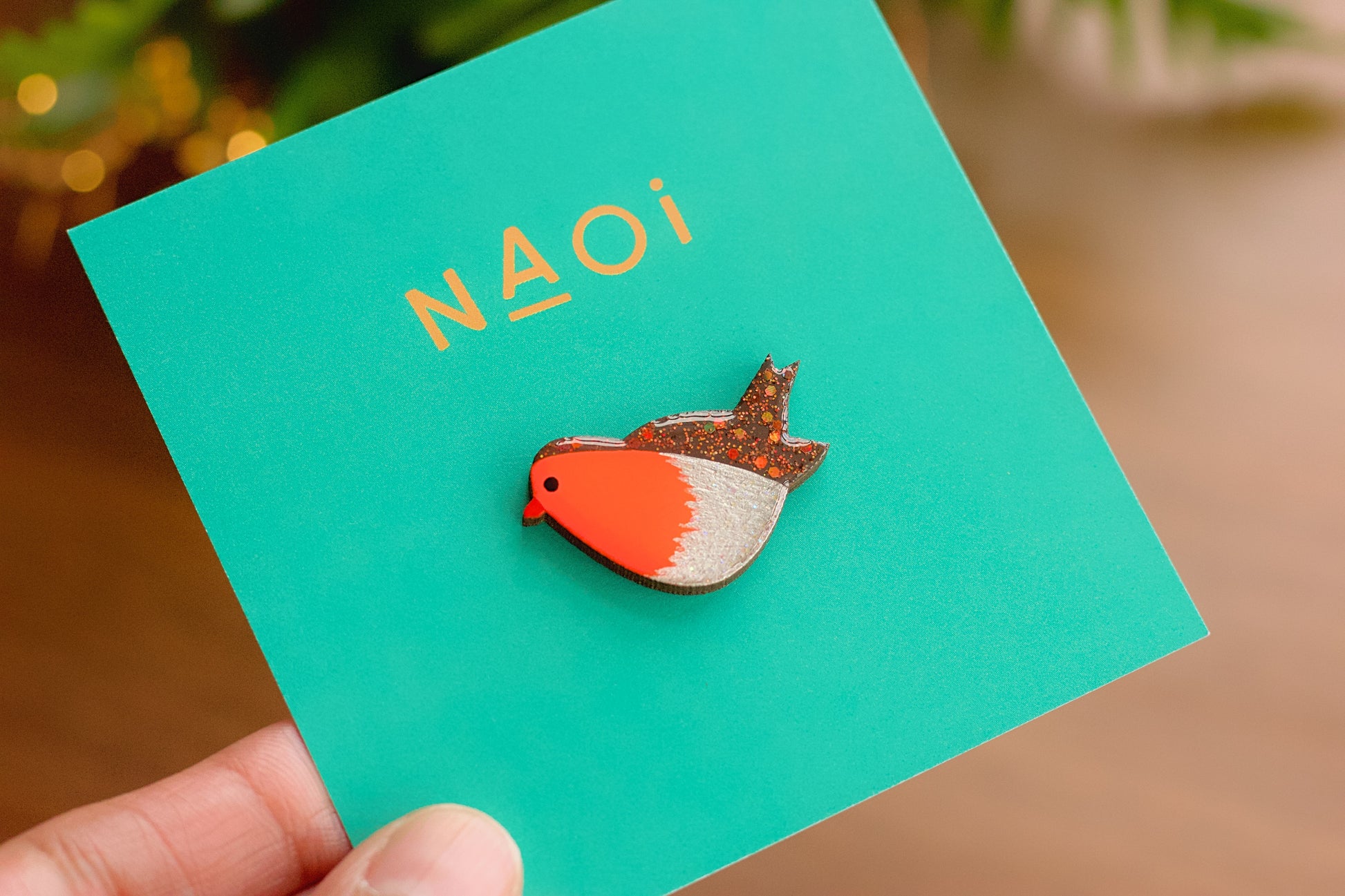 Handpainted wooden robin is 3 x 4cm(L) and 3.2 x 2.2cm(S) in size and attached to a brass butterfly pin.